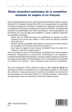 Cet ouvrage étudie la complétive nominale en anglais et en français. Il propose une typologie contractive tout en explicitant les fonctions syntaxiques de cette construction. Il s'intéresse plus particulièrement aux questions suivantes : quels sont les différents types de complétives en that/que et leurs fonctions vis-à-vis du nom recteur ? Qu'en est-il du rôle de ce dernier dans l'énoncé ? Quelles sont les propriétés sémantiques communes aux noms recteurs de complétive et la fonction discursive de celle-ci ? Est également analysée la problématique des traits sémantiques, voire pragmatiques, qui permettent à un nom de régir une complétive.