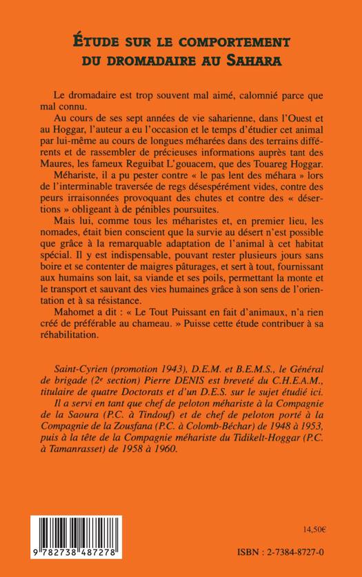 Le dromadaire est trop souvent mal aimé, calomnié parce que mal connu. Au cours de ses sept années de vie saharienne, dans l'Ouest et au Hoggar, l'auteur a eu l'occasion et le temps d'étudier cet animal au cours de longue méharées dans des terrains différents. L'auteur, comme tous les méharistes et, en premier lieu, les nomades, était bien conscient que la survie dans le désert n'est possible que grâce à la remarquable adaptation de l'animal à cet habitat spécial.