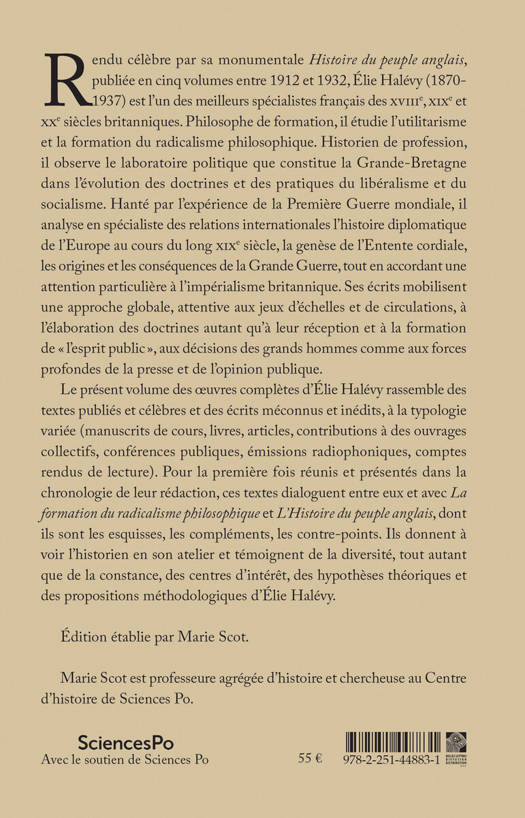 Rendu celebre par sa monumentale Histoire du peuple anglais, publiee en cinq volumes entre 1912 et 1932, Elie Halevy (1870-1937) est l'un des meilleurs specialistes francais des XVIIIe, XIXe et XXe siecles britanniques. Philosophe de formation, il etudie l'utilitarisme et la formation du radicalisme philosophique. Historien de profession, il observe le laboratoire politique que constitue la Grande-Bretagne dans l'evolution des doctrines et des pratiques du liberalisme et du socialisme. Hante par l'experience de la Premiere Guerre mondiale, il analyse en specialiste des relations internationales l'histoire diplomatique de l'Europe au cours du long XIXe siecle, la genese de l'Entente cordiale, les origines et les consequences de la Grande Guerre, tout en accordant une attention particuliere a l'imperialisme britannique. Ses ecrits mobilisent une approche globale, attentive aux jeux d'echelles et de circulations, a l'elaboration des doctrines autant qu'a leur reception et a la formation de l'esprit public , aux decisions des grands hommes comme aux forces profondes de la presse et de l'opinion publique. Le present volume des oeuvres completes d'Elie Halevy rassemble des textes publies et celebres et des ecrits meconnus et inedits, a la typologie variee (manuscrits de cours, livres, articles, contributions a des ouvrages collectifs, conferences publiques, emissions radiophoniques, comptes rendus de lecture). Pour la premiere fois reunis et presentes dans la chronologie de leur redaction, ces textes dialoguent entre eux et avec La formation du radicalisme philosophique et L'Histoire du peuple anglais, dont ils sont les esquisses, les complements, les contre-points. Ils donnent a voir l'historien en son atelier et temoignent de la diversite, tout autant que de la constance, des centres d'interet, des hypotheses theoriques et des propositions methodologiques d'Elie Halevy.