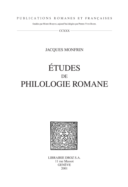 Héritier de Paul Meyer par sa formation, sa passion du document, l’ampleur et la diversité de ses connaissances, ses fonctions académiques, Jacques Monfrin (mort en 1998) a dominé de son autorité la philologie romane en France pendant de nombreuses années. Il restera comme une figure marquante de la discipline. Ce volume rassemble trente-neuf études parues entre 1954 et 1998. On y retrouvera l’exigence intellectuelle et la largeur de vue qui lui étaient propres. On y verra comment la philologie la plus érudite peut s’épanouir en histoire de la culture, pour peu qu’on sache lui poser les bonnes questions.