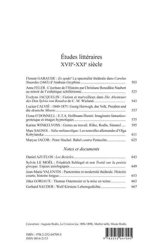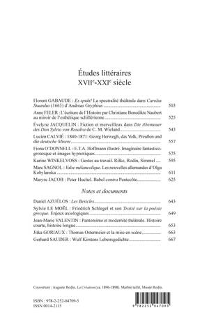 Des contributions consacrées à la littérature germanique depuis le XVIIe siècle, de la spécialité théâtrale chez Andreas Gryphius aux nouvelles allemandes d'Olga Kobylanska en passant par Rainer Maria Rilke, Christoph Martin Wieland, Peter Huchel, entre autres.