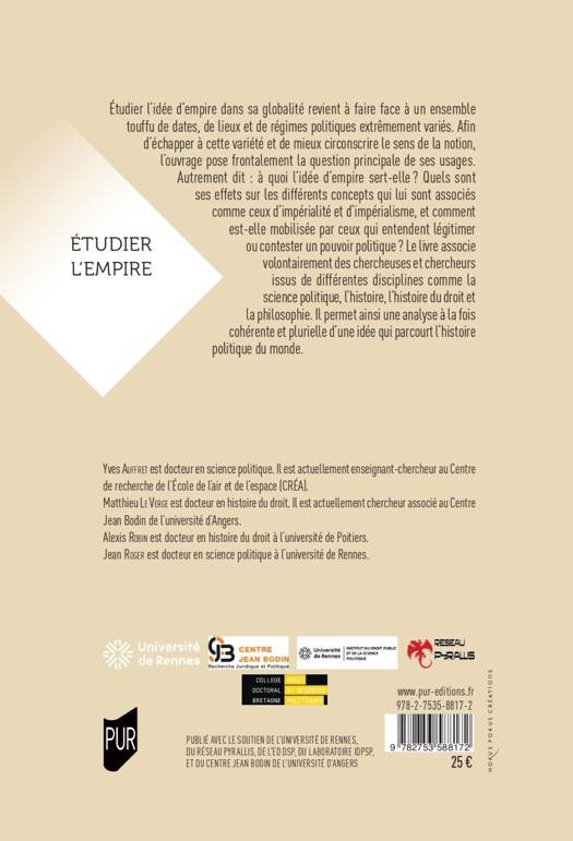 Étudier l’idée d’empire dans sa globalité revient à faire face à un ensemble touffu de dates, de lieux et de régimes politiques extrêmement variés. Afin d’échapper à cette variété et de mieux circonscrire le sens de la notion, l’ouvrage pose frontalement la question principale de ses usages. Autrement dit: à quoi l’idée d’empire sert-elle ? Quels sont ses effets sur les différents concepts qui lui sont associés comme ceux d’impérialité et d’impérialisme, et comment est-elle mobilisée par ceux qui entendent légitimer ou contester un pouvoir politique ? Le livre associe volontairement des chercheuses et chercheurs issus de différentes disciplines comme la science politique, l’histoire, l’histoire du droit et la philosophie. Il permet ainsi une analyse à la fois cohérente et plurielle d’une idée qui parcourt l’histoire politique du monde.