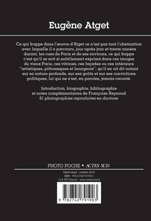 Ce qui frappe dans l'oeuvre d'Atget ce n'est pas tant l'obstination avec laquelle il a parcouru, jour après jour et trente années durant, les rues de Paris et de ses environs, ce qui frappe c'est qu'il se soit si subtilement exprimé dans ces images du vieux Paris, ces vitrines, ces façades ou ces intérieurs « artistiques, pittoresques et bourgeois » qu'il en ait dit autant sur sa nature profonde, sur ses goûts et sur ses convictions politiques, lui qui ne s'est, en paroles, jamais raconté.