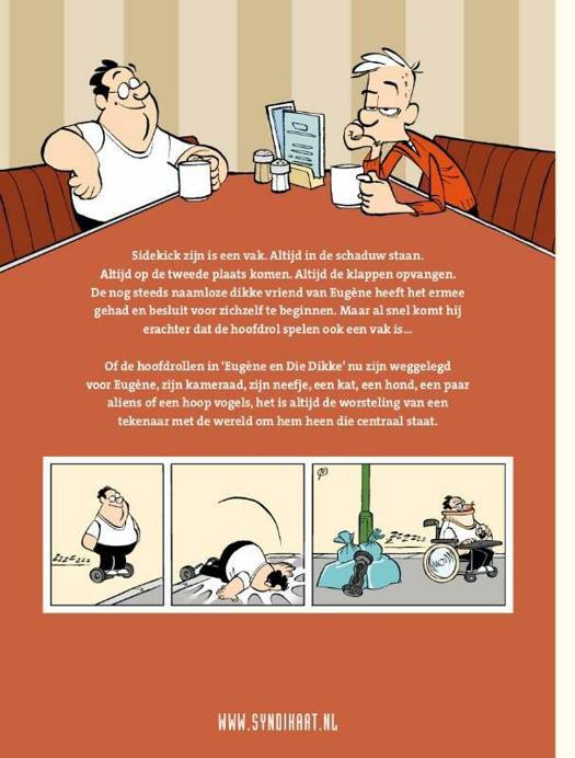 Sidekick zijn is een vak. Altijd in de schaduw staan. Altijd op de tweede plaats komen. Altijd de klappen opvangen. De nog steeds naamloze dikke vriend van Eugène heeft het ermee gehad en besluit voor zichzelf te beginnen. Maar al snel komt hij erachter dat de hoofdrol spelen ook een vak is… Of de hoofdrollen in ‘Eugène en Die Dikke’ nu zijn weggelegd voor Eugène, zijn kameraad, zijn neefje, een kat, een hond, een paar aliens of een hoop vogels, het is altijd de worsteling van een tekenaar met de wereld om hem heen die centraal staat.