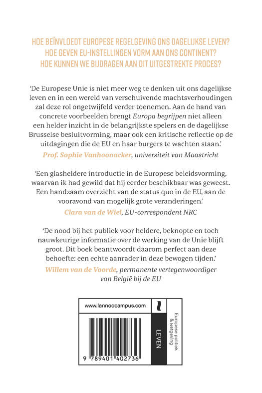 'De Europese Unie is niet meer weg te denken uit ons dagelijkse leven en in een wereld van verschuivende machtsverhoudingen zal deze rol ongetwijfeld verder toenemen. Aan de hand van concrete voorbeelden brengt Europa begrijpen niet alleen een helder inzicht in de belangrijkste spelers en de dagelijkse Brusselse besluitvorming, maar ook een kritische reflectie op de uitdagingen die de EU en haar burgers te wachten staan.' - Prof. Sophie Vanhoonacker, universiteit van Maastricht 'Een glasheldere introductie in de Europese beleidsvorming, waarvan ik had gewild dat hij eerder beschikbaar was geweest. Een handzaam overzicht van de status quo in de EU, aan de vooravond van mogelijk grote veranderingen.' - Clara van de Wiel, EU-correspondent NRC 'De nood bij het publiek voor heldere, beknopte en toch nauwkeurige informatie over de werking van de Unie blijft groot. Dit boek beantwoordt daarom perfect aan deze behoefte: een echte aanrader in deze bewogen tijden.' - Willem van de Voorde, permanente vertegenwoordiger van België bij de EU
