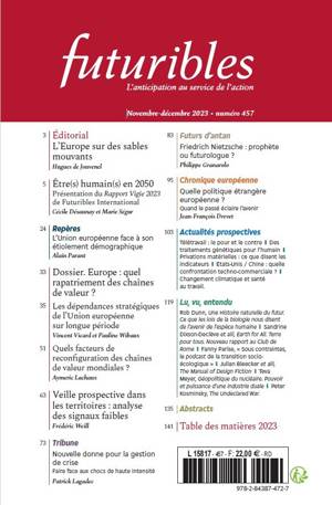 Dossier Europe : quel rapatriement des chaînes de valeur ? - Les dépendances stratégiques de l’Union européenne sur longue période / Vincent Vicard et Pauline Wibaux - Quels facteurs de reconfiguration des chaînes de valeur mondiales ? / Aymeric Lachaux - Veille prospective dans les territoires : analyse des signaux faibles / Frédéric Weill