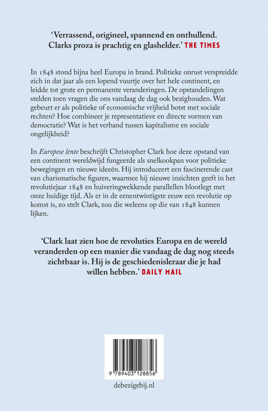 In Europese lente beschrijft Christopher Clark hoe deze opstand van een continent wereldwijd fungeerde als snelkookpan voor politieke bewegingen en nieuwe ideeën. Hij introduceert een fascinerende cast van charismatische figuren, waarmee hij nieuwe inzichten geeft in het revolutiejaar 1848 en huiveringwekkende parallellen blootlegt met onze huidige tijd. Als er in de eenentwintigste eeuw een revolutie op komst is, zo stelt Clark, zou die weleens op die van 1848 kunnen lijken.
