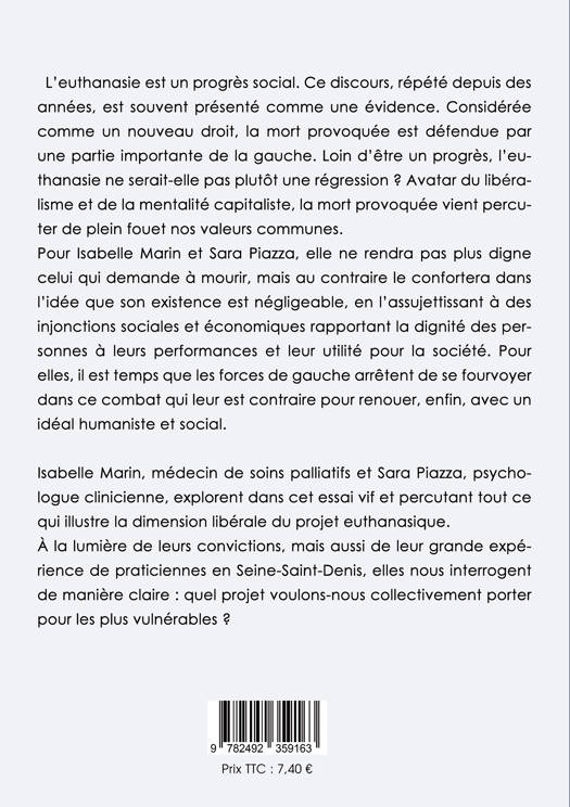 L'euthanasie est un progrès social. Ce discours, répété depuis des années, est souvent présenté comme une évidence. Considérée comme un nouveau droit, la mort provoquée est défendue par une partie importante de la gauche. Loin d'être un progrès, l'euthanasie ne serait-elle pas plutôt une régression ? Avatar du libéralisme et de la mentalité capitaliste, la mort provoquée vient percuter de plein fouet nos valeurs communes. Pour Isabelle Marin et Sara Piazza, elle ne rendra pas plus digne celui qui demande à mourir, mais au contraire le confortera dans l'idée que son existence est négligeable, en l'assujettissant à des injonctions sociales et économiques rapportant la dignité des personnes à leurs performances et leur utilité pour la société. Pour elles, il est temps que les forces de gauche arrêtent de se fourvoyer dans ce combat qui leur est contraire pour renouer, enfin, avec un idéal humaniste et social.