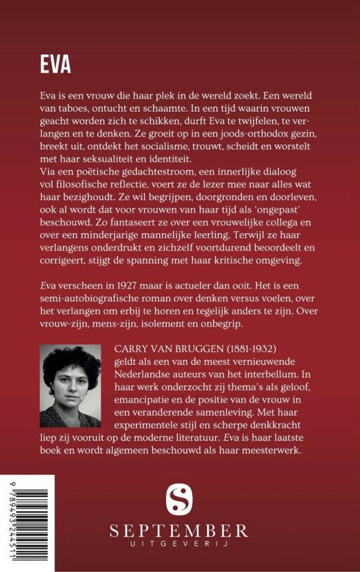 'Eva' verscheen in 1927 maar is actueler dan ooit. Het is een semi-autobiografische roman over denken versus voelen, over het verlangen om erbij te horen en tegelijk anders te zijn. Over vrouw-zijn, mens-zijn, isolement en onbegrip.