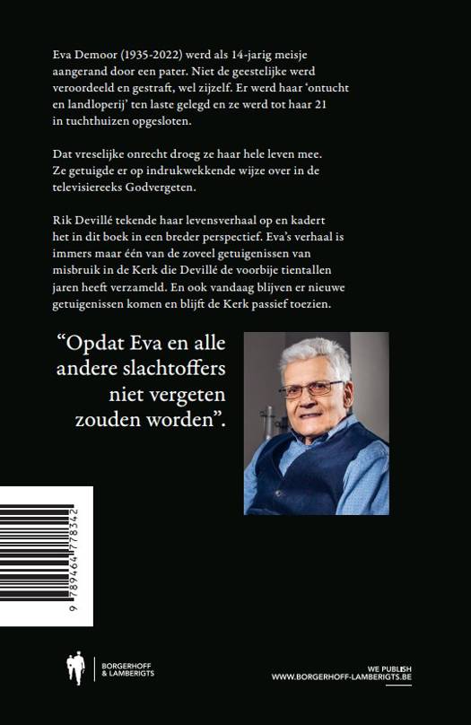 Rik Devillé tekende haar levensverhaal op en kadert ze in dit boek in een breder perspectief. Eva’s verhaal is immers maar één van de zoveel getuigenissen van misbruik in de Kerk die Devillé de voorbije tientallen jaren heeft verzameld. En ook vandaag blijven er nieuwe getuigenissen komen en blijft de Kerk passief toezien.