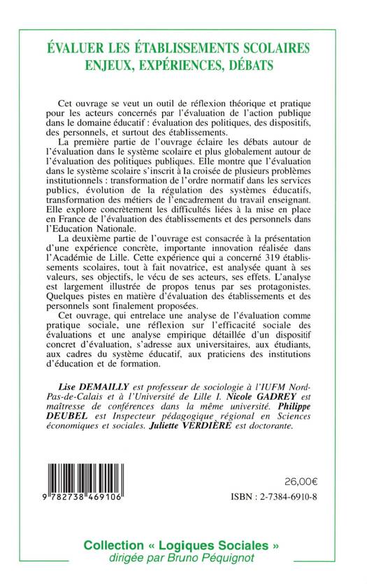 Cet ouvrage se veut un outil de réflexion théorique et pratique pour les acteurs concernés par l'évaluation de l'action publique dans le domaine éducatif : évaluation des politiques, des dispositifs, des personnels, et surtout des établissements. La première partie de l'ouvrage éclaire les débats autour de l'évaluation dans le système scolaire et plus globalement autour de l'évaluation des politiques publiques. La deuxième partie de l'ouvrage est consacrée à la présentation d'une expérience concrète, importante innovation réalisée dans l'Académie de Lille.