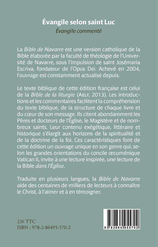 L'évangile de Luc occupe la troisième position dans la liste des écrits du Nouveau Testament. Certains manuscrits occidentaux le placent après ceux de Matthieu et Jean, accordant ainsi la préséance aux évangiles composés par des Apôtres sur ceux rédigés par des disciples. Cependant la grande majorité suit l'ordre Matthieu, Marc, Luc et Jean. On distingue nettement trois parties de longueur plus ou moins égale : le ministère de Jésus en Galilée, le ministère pendant la montée vers Jérusalem et le ministère dans la Ville sainte. Elles sont précédées d'un prologue et de « l'Évangile de l'enfance ». Dans ce plan schématique, le récit de Luc se distingue par l'importance accordée à la deuxième partie : le ministère pendant la montée vers Jérusalem. Dans les autres évangiles synoptiques, ce « voyage » occupe deux ou trois chapitres ; ici, il s'étend sur dix chapitres, dans lesquels Luc souligne tout particulièrement la portée universelle du salut prêché par Jésus. La Bible de Navarre est une version catholique de la Bible élaborée par la faculté de théologie de l'Université de Navarre, sous l'impulsion de saint Josémaria Escriva, fondateur de l'Opus Dei. Achevé en 2004, l'ouvrage est constamment actualisé depuis. Le texte biblique de cette édition française est celui de la Bible de la liturgie (Aelf, 2013). Les introductions et les commentaires facilitent la compréhension du texte biblique, de la structure de chaque livre et du coeur de son message. Ils citent abondamment les Pères et docteurs de l'Église, le Magistère et de nombreux saints. Leur contenu exégétique, littéraire et historique s'élargit aux horizons de la spiritualité et de la doctrine de la foi. Ces caractéristiques font de cette édition un ouvrage unique en son genre qui, selon les grandes orientations du concile oecuménique Vatican II, invite à une lecture inspirée, une lecture de la Bible dans l'Église. Traduite en plusieurs langues, la Bible de Navarre aide des centaines de milliers de lecteurs à connaître le Christ, à l'aimer et à en témoigner.