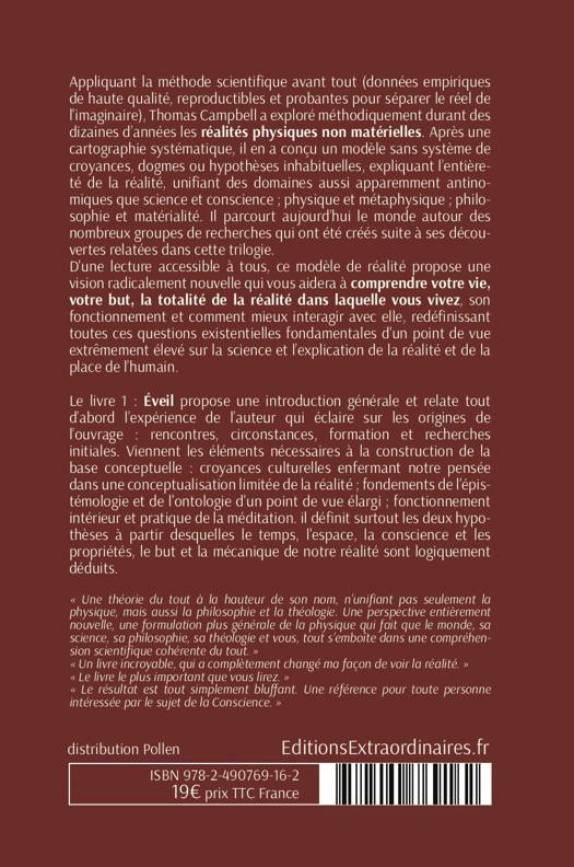 Ce modèle de réalité vous aidera à comprendre votre vie, votre but, la totalité de la réalité dans laquelle vous vivez, son fonctionnement et comment mieux interagir avec elle. Une trilogie unifiant philosophie, physique et métaphysique. Livre 1 : Éveil — L'expérience de l'auteur nous éclaire sur les origines de l'ouvrage : rencontres, circonstances, formation et recherches initiales. Viennent les éléments nécessaires à la construction de la base conceptuelle : croyances culturelles enfermant notre pensée dans une conceptualisation limitée de la réalité ; fondements de l'épistémologie et de l'ontologie d'un point de vue élargi ; fonctionnement intérieur et pratique de la méditation. Il définit surtout les deux hypothèses à partir desquelles le temps, l'espace, la conscience et les propriétés, le but et la mécanique de notre réalité sont logiquement déduits.