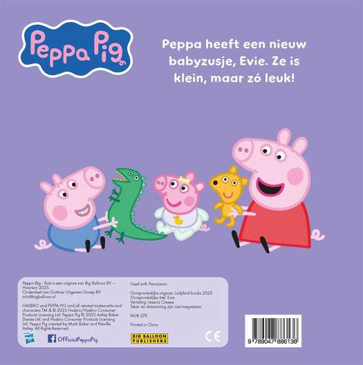 In het Peppa Pig 'Evie'-kartonboek, krijgen Peppa en George een babyzusje, Evie. Ze zat eerst in de buik van Mama Big. Evie is heel klein, huilt soms, maar is zó leuk!