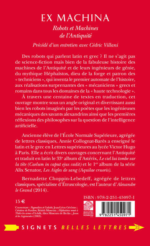 Precede d'un entretien avec Cedric Villani. Des robots qui parlent latin et grec ? Il ne s'agit pas de science-fiction mais bien de la fabuleuse histoire des machines de l'Antiquite et de leurs ingenieurs de genie, du mythique Hephaistos, dieu de la forge et patron des techniciens , qui inventa le premier automate de l'histoire, aux realisations surprenantes des mecaniciens grecs et romains dans tous les domaines de la haute technologie . A travers une centaine de textes en traduction, cet ouvrage montre sous un angle original et divertissant aussi bien les robots imagines par les poetes que les ingenieuses mecaniques des savants alexandrins ainsi que les premieres reflexions des philosophes sur la question de l'intelligence artificielle.