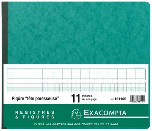 Piqûre 27x32cm à tête paresseuse 11 colonnes sur 1 page - 28 lignes - 80 pages La clarté des tracés Exacompta et leur qualité d'impression avec une encre verte spéciale sont reconnues et appréciées depuis des années. "La piqûre à colonnes est un support souple et pratique pour consigner tout ce qui s'enregistre, se compte, se classe. Les tracés pré-imprimés simplifient les reports sur les pages numérotées. La ""tête paresseuse"" est une formule astucieuse pour éviter les reports des en-têtes de colonnes d'une page à l'autre. Les têtes de colonnes et les colonnes elles-mêmes restent parfaitement alignées. La consultation est ainsi aisée et rapide. Choisissez votre piqûre en fonction du nombre de relevés que vous devez faire par ligne, et donc du nombre de colonnes nécessaires." Le Papier 110 g/m2 est légèrement teinté, spécialement étudié pour reposer la vue, et mat pour une écriture facile et nette. Il est certifié FSC®, un mode de gestion responsable des forêts. La couverture en carte lustrée est issue de nos papeteries Clairefontaine, elle est noble, rigide, résistante et écologique car également certifiée FSC®. Les piqûres et registres Exacompta sont fabriqués à 100% en France.