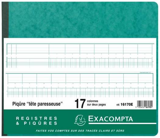 Piqûre 27x32cm à tête paresseuse 17 colonnes sur 2 pages - 31 lignes - 80 pages La clarté des tracés Exacompta et leur qualité d'impression avec une encre verte spéciale sont reconnues et appréciées depuis des années. "La piqûre à colonnes est un support souple et pratique pour consigner tout ce qui s'enregistre, se compte, se classe. Les tracés pré-imprimés simplifient les reports sur les pages numérotées. La ""tête paresseuse"" est une formule astucieuse pour éviter les reports des en-têtes de colonnes d'une page à l'autre. Les têtes de colonnes et les colonnes elles-mêmes restent parfaitement alignées. La consultation est ainsi aisée et rapide. Choisissez votre piqûre en fonction du nombre de relevés que vous devez faire par ligne, et donc du nombre de colonnes nécessaires." Le Papier 110 g/m2 est légèrement teinté, spécialement étudié pour reposer la vue, et mat pour une écriture facile et nette. Il est certifié FSC®, un mode de gestion responsable des forêts. La couverture en carte lustrée est issue de nos papeteries Clairefontaine, elle est noble, rigide, résistante et écologique car également certifiée FSC®. Les piqûres et registres Exacompta sont fabriqués à 100% en France.