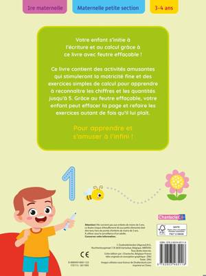 Ce livre contient des activités amusantes qui stimuleront la motricité fine et l’apprentissage de l’écriture. Il propose également des exercices simples de calcul pour apprendre à reconnaître les chiffres et les quantités jusqu’à 5. Grâce au feutre effaçable, votre enfant peut effacer la page et refaire les exercices autant de fois qu’il lui plaît.