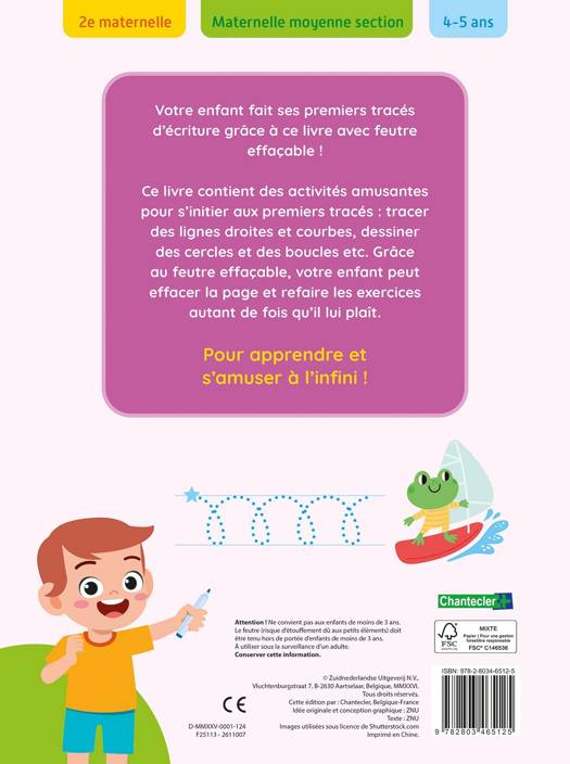 Ce livre contient des activités amusantes pour s’initier aux premiers tracés : tracer des lignes droites et courbes, dessiner des cercles et des boucles etc. Grâce au feutre effaçable, votre enfant peut effacer la page et refaire les exercices autant de fois qu’il lui plaît.