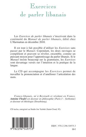 Les Exercices de parler libanais s'inscrivent dans la continuité du Manuel de parler libanais. Si le Manuel insiste beaucoup sur la grammaire, les Exercices sont davantage versés sur l'intuition et la pratique de la langue. Un CD permet de travailler la prononciation et d'améliorer l'articulation des mots.