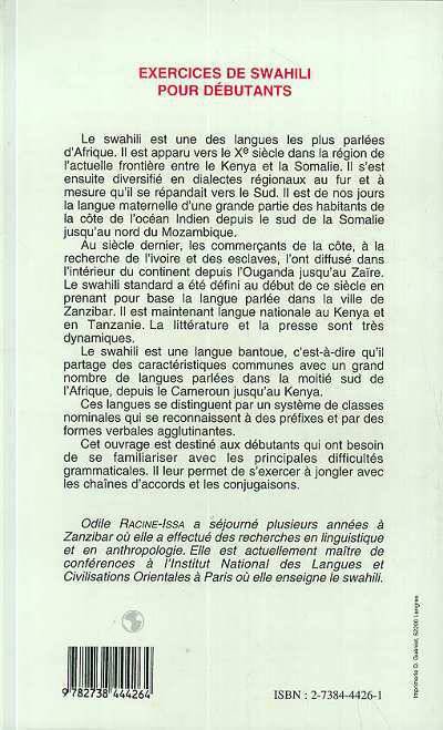 Au siècle dernier, les commerçants de la côte, à la recherche de l'ivoire et des esclaves, l'ont diffusé dans l'intérieur du continent depuis l'Ouganda jusqu'au Zaïre. Le swahili standard a été défini au début de ce siècle en prenant pour base la langue parlée dans la ville de Zanzibar. Il est maintenant langue nationale au Kenya et en Tanzanie. La littérature et la presse sont très dynamiques.