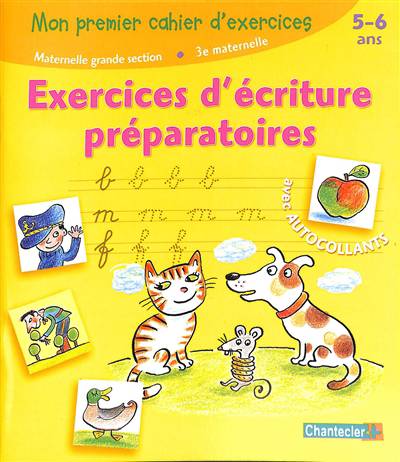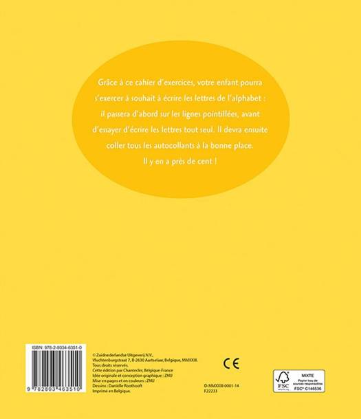 Grâce à ce cahier d'exercices, votre enfant pourra s'exercer à souhait à écrire les lettres de l'alphabet : il passera d'abord sur les lignes pointillées, avant d'essayer d'écrire les lettres tout seul. Il devra ensuite coller tous les autocollants à la bonne place. Il y en a près de cent ! Il y a également un cahier d'exercices d'écriture pour les enfants du CP/de 1re primaire.