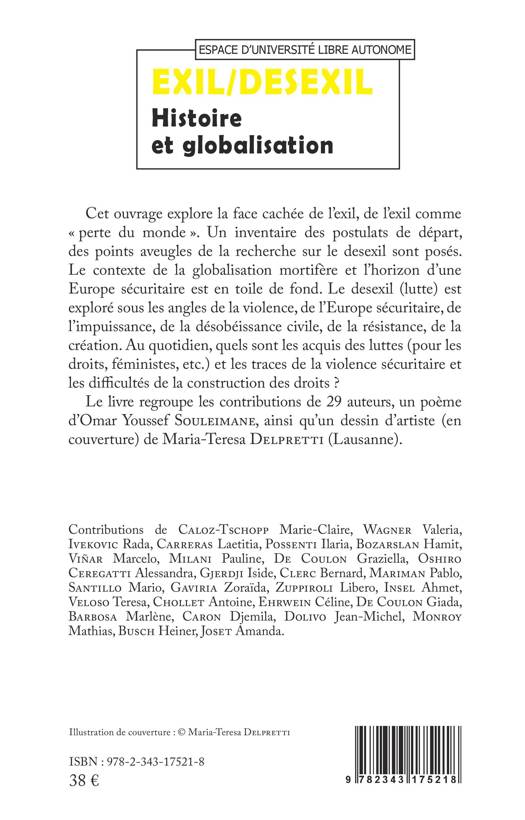 Cet ouvrage explore la face cachée de l'exil, de l'exil comme "perte du monde". Un inventaire des postulats de départ, des points aveugles de la recherche sur le desexil sont posés. Le contexte de la globalisation mortifère et l'horizon d'une Europe sécuritaire est en toile de fond. Le desexil (lutte) est exploré sous les angles de la violence, de l'Europe sécuritaire, de l'impuissance, de la désobéissance civile, de la résistance, de la création. Au quotidien, quels sont les acquis des luttes (pour les droits, féministes, etc.) et les traces de la violence sécuritaire et les difficultés de la construction des droits ? Le livre regroupe les contributions de 29 auteurs, un poème d'Omar Youssef Souleimane ainsi qu'un dessin d'artiste (en couverture) de Maria-Teresa Delpretti (Lausanne).