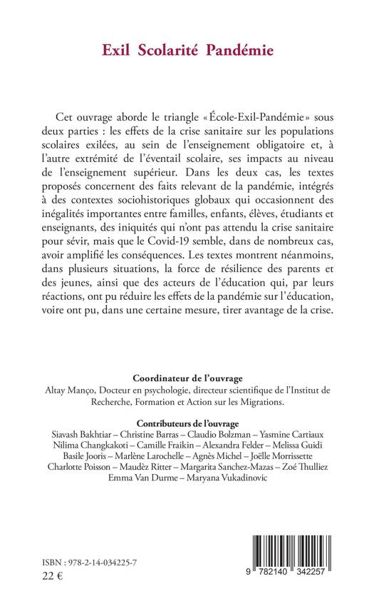 Cet ouvrage aborde le triangle « École-Exil-Pandémie » sous deux parties : les effets de la crise sanitaire sur les populations scolaires exilées, au sein de l'enseignement obligatoire et, à l'autre extrémité de l'éventail scolaire, ses impacts au niveau de l'enseignement supérieur. Dans les deux cas, les textes proposés concernent des faits relevant de la pandémie, intégrés à des contextes sociohistoriques globaux qui occasionnent des inégalités importantes entre familles, enfants, élèves, étudiants et enseignants, des iniquités qui n'ont pas attendu la crise sanitaire pour sévir, mais que le Covid-19 semble, dans de nombreux cas, avoir amplifié les conséquences. Les textes montrent néanmoins, dans plusieurs situations, la force de résilience des parents et des jeunes, ainsi que des acteurs de l'éducation qui, par leurs réactions, ont pu réduire les effets de la pandémie sur l'éducation, voire ont pu, dans une certaine mesure, tirer avantage de la crise.