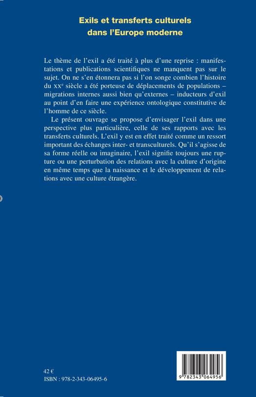 Cet ouvrage envisage l'exil dans son rapport avec les transferts culturels. L'exil y est en effet traité comme un ressort important d'échanges. Qu'il s'agisse de sa forme réelle ou imaginaire, l'exil signifie toujours une rupture ou une perturbation des relations avec la culture d'origine en même temps que la naissance et le développement de relations avec une culture étrangère au point de devenir une expérience ontologique constitutive de l'homme de ce siècle.