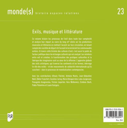 Ce volume éclaire les processus de l’exil dans toute leur complexité et analyse leur impact au cours du long XXe siècle sur les productions musicales et littéraires en mettant l’accent sur leur circulation, en tenant compte des sociétés de départ et d’accueil et en éclairant les communautés exilées. À travers cette histoire des cultures d’exil, c’est aussi le poids du facteur politique dans les échanges culturels qui est analysé. Les relations entre exil et création, la transformation des pratiques culturelles et la fabrique des imaginaires sont au coeur de la réflexion. L’approche globale des exils artistiques, qui traverse les continents et les formes, interroge le rôle des exilés – et des mouvements de solidarité internationale qu’ils suscitent – dans le processus de mondialisation contemporaine.