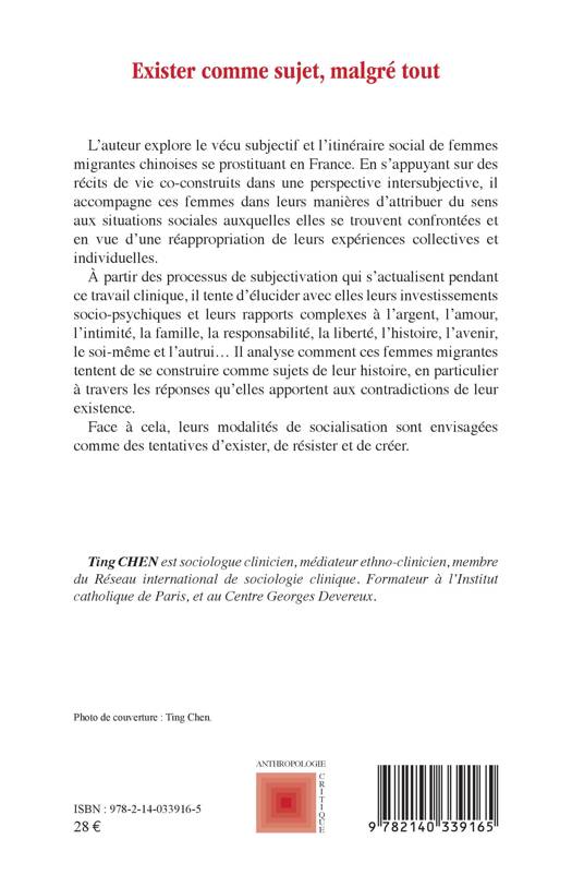 L'auteur explore le vécu subjectif et l'itinéraire social de femmes migrantes chinoises se prostituant en France. En s'appuyant sur des récits de vie co-construits dans une perspective intersubjective, il accompagne ces femmes dans leurs manières d'attribuer du sens aux situations sociales auxquelles elles se trouvent confrontées et en vue d'une réappropriation de leurs expériences collectives et individuelles. À partir des processus de subjectivation qui s'actualisent pendant ce travail clinique, il tente d'élucider avec elles leurs investissements socio-psychiques et leurs rapports complexes à l'argent, l'amour, l'intimité, la famille, la responsabilité, la liberté, l'histoire, l'avenir, le soi-même et l'autrui... Il analyse comment ces femmes migrantes tentent de se construire comme sujets de leur histoire, en particulier à travers les réponses qu'elles apportent aux contradictions de leur existence. Face à cela, leurs modalités de socialisation sont envisagées comme des tentatives d'exister, de résister et de créer.