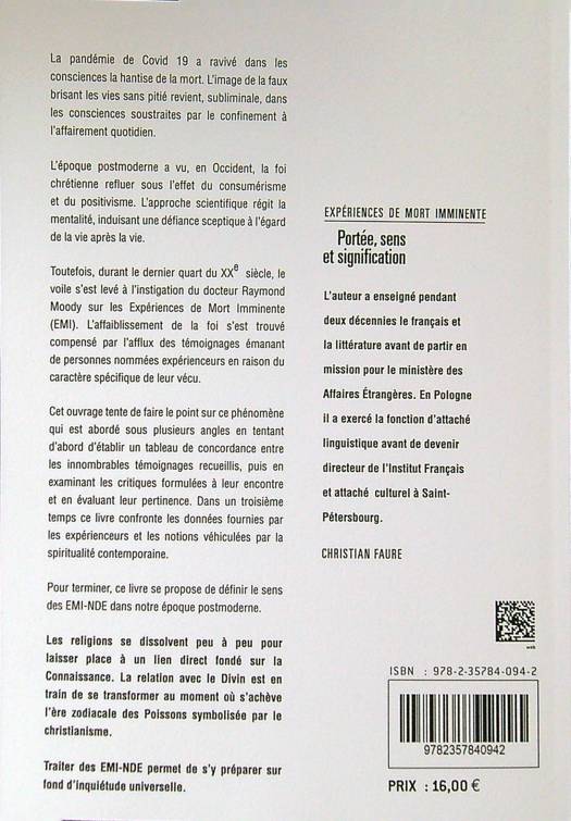 La pandémie de Covid 19 a ravivé dans les consciences la hantise de la mort. L’image de la faux brisant les vies sans pitié revient, subliminale, dans les consciences soustraites par le confinement à l’affairement quotidien. L’époque postmoderne a vu, en Occident, la foi chrétienne refluer sous l’effet du consumérisme et du positivisme. L’approche scientifique régit la mentalité, induisant une défiance sceptique à l’égard de la vie après la vie. Toutefois, durant le dernier quart du XXe siècle, le voile s’est levé à l’instigation du docteur Raymond Moody sur les expériences de mort imminente (EMI). L’affaiblissement de la foi s’est trouvé compensé par l’afflux des témoignages émanant de personnes nommées expérienceurs en raison du caractère spécifique de leur vécu. Cet ouvrage tente de faire le point sur ce phénomène. La question est abordée sous plusieurs angles en tentant d’abord d’établir un tableau de concordance entre les innombrables témoignages recueillis, puis en examinant les critiques formulées à leur encontre et en évaluant leur pertinence. Dans un troisième temps ce livre confronte les données fournies par les expérienceurs et les notions véhiculées par la spiritualité contemporaine. Pour terminer, ce livre se propose de définir le sens des EMI-NDE dans notre époque postmoderne. Tandis que la confusion se répand dans les esprits, obscurcissant la vision des uns et des autres, les témoignages apportent des éclats d’une Lumière qui ne s’est jamais éteinte dans le cœur des hommes. Les religions se dissolvent peu à peu pour laisser place à un lien direct fondé sur la Connaissance. La relation avec le Divin est en train de se transformer au moment où s’achève l’ère zodiacale des Poissons symbolisée par le christianisme. Traiter des EMI-NDE permet de s’y préparer sur fond d’inquiétude universelle.