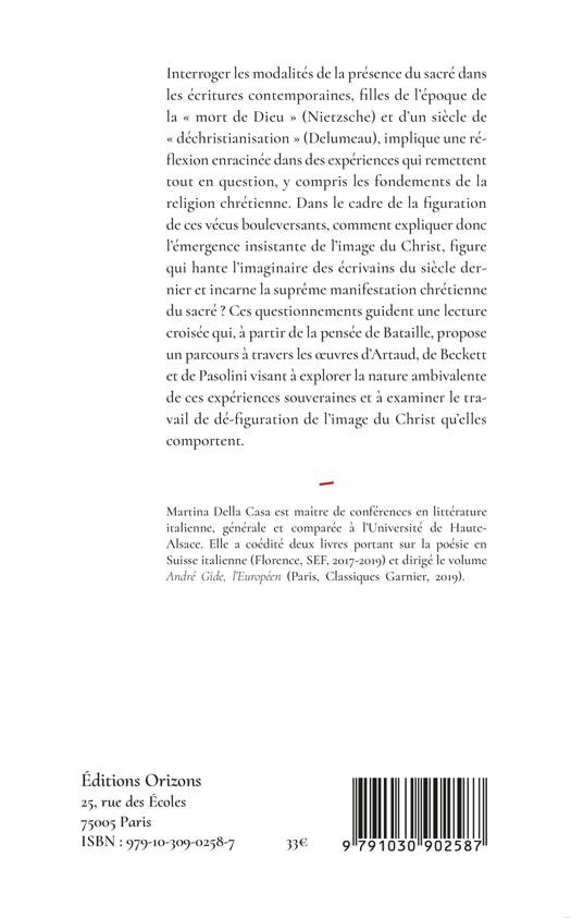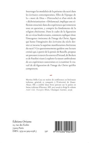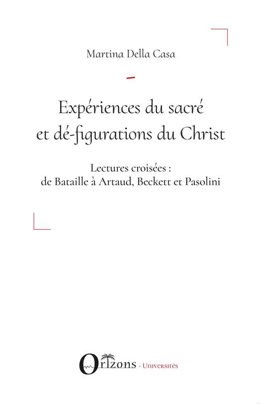 Interroger les modalités de la présence du sacré dans les écritures contemporaines, filles de l’époque de la « mort de Dieu » (Nietzsche) et d’un siècle d « déchristianisation ». (Delumea), implique une réflexion enracinée dans des expériences qui remettent tout en question, y compris les fondements de la religion chrétienne. Dans le cadre de la figuration de ces vécus bouleversants, comment expliquer donc l’émergence insistante de l’image du Christ, figure qui hante l’imaginaire des écrivains du siècle dernier et incarne la suprême manifestation chrétienne du sacré ? Ces questionnements guident une lecture croisée qui, à partir de la pensée de Bataille, propose un parcours à travers les ouvres d’Artaud, de Beckett et de Pasolini visant à explorer la nature ambivalente de ces expériences souveraines et à examiner le travail de dé-figuration de l’image du Christ qu’elles comportent.