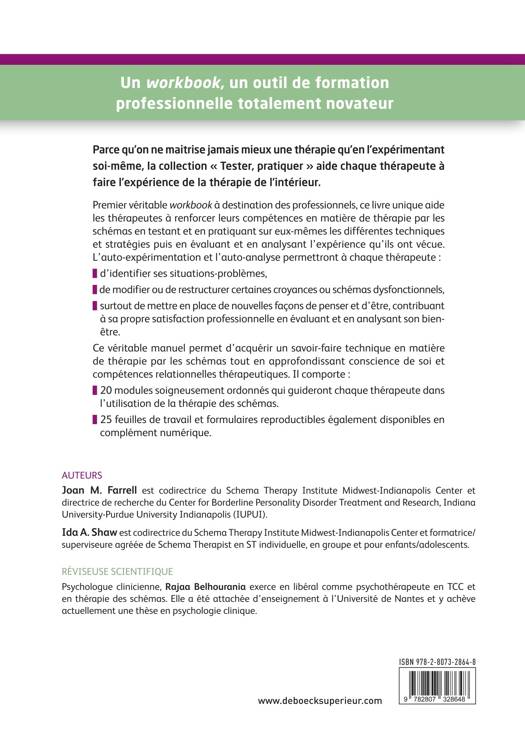 Parce qu'on ne maitrise jamais mieux quelque chose qu'en l'expérimentant soi-même, cette collection aide chaque thérapeute à faire l'expérience de la thérapie de l'intérieur. Un outil de formation professionnelle totalement novateur. Utiliser la thérapie des schémas sur soi avant de l'appliquer à ses patients permet de mieux comprendre comment elle fonctionne, quelles sont les situations problèmes et comment modifier et restructurer certaines croyances/schémas dysfonctionnels afin de mettre en place de nouvelles façons de penser et d’être.