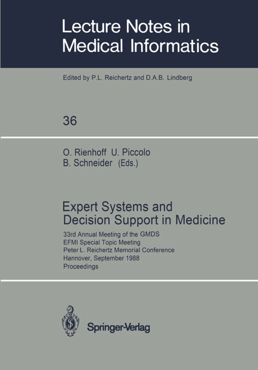 The 33rd Annual Meeting of the German Association for Medical Documentation, Informatics and Statistics was combined with a Special Topic Conference of the European Federation for Medical Informatics and takes place at Hannover, F. R. of Germany, from September 26 to 29, 1988. It was planned and initililly prepared by the late Prof. P. L Reichertz, who headed the Hannover institute from 1969 to 1987. To commemorate his contribution to the development of medicine the conference was devoted to him "Peter Reichertz Memorial Conference on Expert Systems and Decision Support in Medicine" Since computers in the early Fifties were first applied to support medical reasoning, various phases of euphoria and resi ation have . followed. Every new methodology which became technically possible was and will be applied to the old questlon of how to diagnose diseases more reliably. Artificial Intelligence is just one new approach to the old challenge. Over the years some- authors have been very optimistic and put forward opinions which motivated the common press to coin the phrase 'Dr. med. computer'. Papers printed under this heading rebuffed the majority of physiCians for many years. Today we know that medical decision making is a most complex buman performance. And 30 years of research on decision support have given us only limited insight into the underlying processes. Most of the principal methodological questions were already asked very early on.