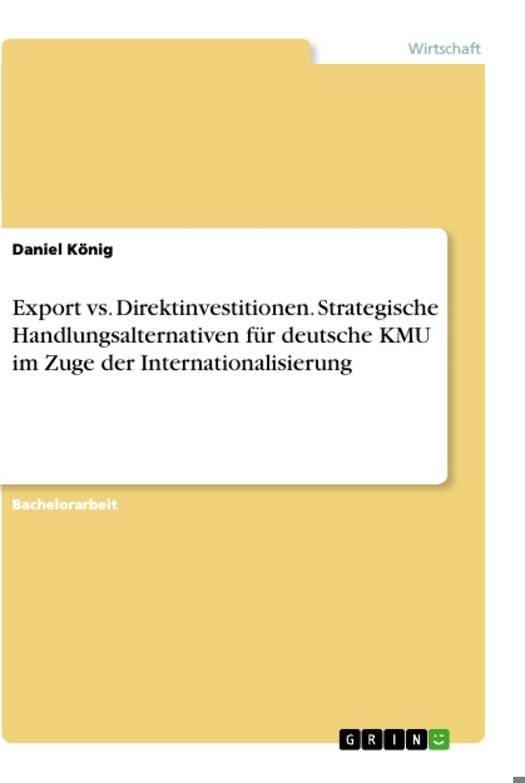 Bachelorarbeit aus dem Jahr 2017 im Fachbereich BWL - Unternehmensführung, Management, Organisation, Note: 1,7, Hochschule Mainz, Sprache: Deutsch, Abstract: Die vorliegende Arbeit befasste sich zum einen mit den Internationalisierungsgründen von kleinen und mittleren Unternehmen (KMU). Zum anderen wurden die beiden Internationalisierungsformen "Export" und "Direktinvestitionen" näher betrachtet. Statistisch gesehen machen KMU 99,6 % aller Unternehmen in Deutschland aus. Sie repräsentieren damit einen beachtlichen Teil der deutschen Wirtschaft. Rund ein Viertel aller KMU erwirtschaftet Umsätze auf internationalen Märkten. Insbesondere der Export bildet eine nahezu unumgängliche Markteintritts- bzw. Marktbearbeitungsform im Auslandsgeschäft. Daneben engagieren sich KMU zusehends mittels Direktinvestitionen auf ausländischen Märkten. Hierbei wurde der Frage nachgegangen, ob Direktinvestitionen einen Vorteil gegenüber Exporte für KMU mit sich bringen. Um dies zu erreichen wurden sechs Experten befragt. Diese befanden sich, zum damaligen Stand, allesamt in einer Führungsposition bei international tätigen deutschen KMU. Des Weiteren wurden Erkenntnisse aus älterer und jüngerer Literatur zusammengetragen und mit den Expertenbefragungen verknüpft. Aus der Untersuchung ist hervorgegangen, dass die Internationalisierungsgründe von KMU sehr vielfältig sind. Als besonders dominant stellte sich dabei das Motiv der Absatzmarkterschließung heraus. Daneben erwies sich die Verbesserung der Kostensituation als einen entscheidenden Grund für die Internationalisierung von KMU dar. Bezugnehmend auf das zweite Forschungsziel konnte kein eindeutiger Vorteil für Direktinvestitionen gegenüber Exporten identifiziert werden. Trotz des Ausbleibens eines entscheidenden Vorteils, ließ sich feststellen, dass Exporte und Direktinvestitionen von KMU in der amtlichen Statistik untererfasst sind. Dies ist vornehmlich auf bestimmte Meldeschwellen zurückzuführen. So bilden gerade KMU ein wichtiges u