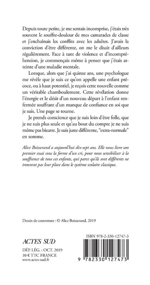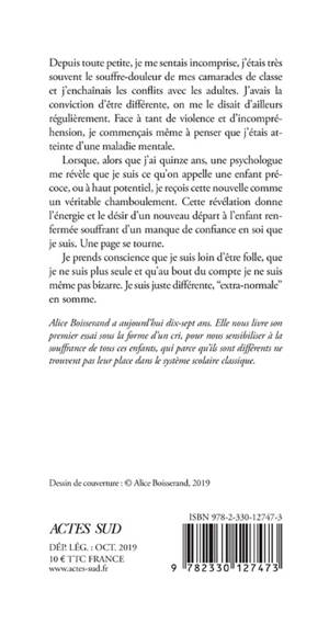Alice a aujourd'hui dix-sept ans, c'est une enfant précoce. Elle nous livre son premier essai sous forme de cri pour nous sensibiliser à la souffrance de tous ces enfants, qui parce qu'ils sont différents ne trouvent pas leur place dans le système scolaire. Aujourd'hui diagnostiquée comme étant une enfant à haut potentiel, elle a intégré une école qui répond à ses besoins spécifiques et l'aide à dépasser la souffrance et l'incompréhension qui ont marqué ses jeunes années.