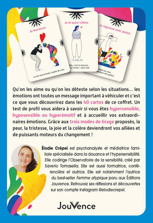 Qu’on les aime ou qu’on les déteste selon les situations… les émotions ont toutes un message important à véhiculer et c’est ce que vous découvrirez dans les 40 cartes de ce coffret. Un test de profil vous aidera à savoir si vous êtes hypersensible, hyposensible ou hyperémotif et à accueillir vos extraordinaires émotions.