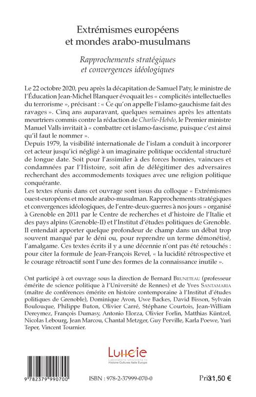 Depuis 1979, la visibilité internationale de l'islam a conduit à incorporer cet acteur jusqu'ici négligé à un imaginaire politique occidental structuré de longue date. Soit pour l'assimiler à des forces honnies, vaincues et condamnées par l'Histoire, soit afin de délégitimer des adversaires recherchant des accommodements toxiques avec une religion politique conquérante. Les textes réunis dans cet ouvrage sont issus d'un colloque organisé à Grenoble en 2011 par le Centre de recherches et d'histoire de l'Italie et des pays alpins (Grenoble-II) et l'Institut d'études politiques de Grenoble. Il entendait apporter quelque profondeur de champ dans un débat trop souvent marqué par le déni ou, pour reprendre un terme démonétisé, l'amalgame. Ces textes écrits il y a une décennie n'ont pas été retouchés.