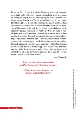 S’il est un lieu où tout le « siècle d’Auguste » vient se résumer, avec toute sa lyre et ses couleurs contrastées, c’est bien dans les Fables, où Virgile, Horace, les élégiaques, retrouvent leur voix sous celle de Phèdre et d’Esope, et où Ovide, qui a chanté tant de métamorphoses d’hommes en animaux, revient avec une tout autre séduction alexandrine que chez Benserade ou chez Du Ryer. Lieu d’affleurement de tant de richesses contradictoires de la tradition poétique française, les Fables s’offrent en outre le luxe de réverbérer dans toute leur diversité les saveurs de la poésie romaine à son point de suprême maturité. Il y a bien quelque chose de pantagruélique dans l’art de La Fontaine, le plus érudit de notre langue ; mais ce qui se voyait chez Rabelais, ce qui était voyant chez Ronsard, s’évapore chez lui en une essence volatile et lumineuse, où des visions dignes d’Homère apparaissent, et ne se dissipent pas. Le génie d’une langue et celui d’une culture millénaire se concentrent ici en un point où la justesse de la voix et celle du regard suffisent à tout dire d’un mot.