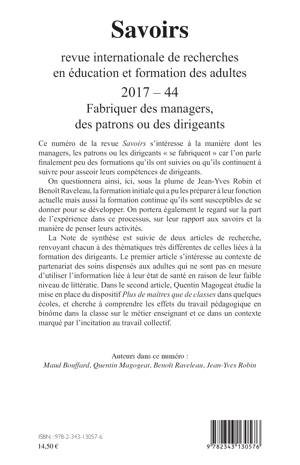 Ce numéro de la revue "Savoir"s'intéresse à la manière dont les managers et patrons "se fabriquent" car la question de la formation des dirigeants est peu évoquée en entreprise. On s'intéresse ainsi à la formation initiale les ayant préparés à leurs fonctions mais aussi à la formation continue qu'ils sont susceptibles de suivre pour se développer.