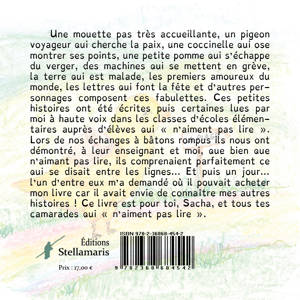 Une mouette pas très accueillante, un pigeon voyageur qui cherche la paix, une coccinelle qui ose montrer ses points, une petite pomme qui s’échappe du verger, des machines qui se mettent en grève, la terre qui est malade, les premiers amoureux du monde, les lettres qui font la fête et d’autres personnages composent ces fabulettes. Ces petites histoires ont été écrites puis certaines lues par moi à haute voix dans les classes d’écoles élémentaires auprès d’élèves qui « n’aiment pas lire ». Lors de nos échanges à bâtons rompus ils nous ont démontré, à leur enseignant et moi, que bien que n’aimant pas lire, ils comprenaient parfaitement ce qui se disait entre les lignes... Et puis un jour… l’un d’entre eux m’a demandé où il pouvait acheter mon livre car il avait envie de connaître mes autres histoires ! Ce livre est pour toi, Sacha, et tous tes camarades qui « n’aiment pas lire ».