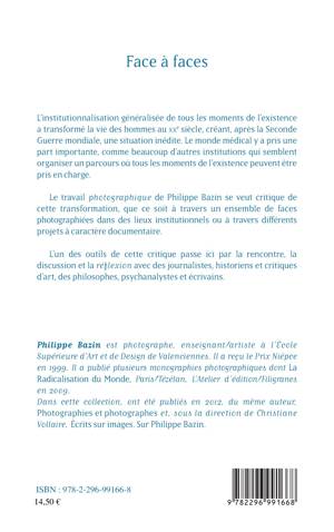 L'institutionnalisation généralisée de tous les moments de l'existence a transformé la vie des hommes au xxe siècle, créant, après la Seconde Guerre mondiale, une situation inédite. Le travail photographique de Philippe Bazin se veut critique de cette transformation, que ce soit à travers un ensemble de faces photographiées dans des lieux institutionnels ou à travers différents projets à caractère documentaire.