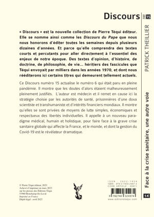 « Discours » est la nouvelle collection de Pierre Téqui éditeur. Elle se nomme ainsi comme le Discours du Pape que nous nous honorons d’éditer toutes les semaines depuis plusieurs dizaines d’années. Et parce qu’elle comprendra des textes courts et percutants pour aller directement à l’essentiel des enjeux de notre époque. Des textes d’opinion, d’histoire, de doctrine, de philosophie, de vie… héritiers des fascicules que Téqui envoyait par milliers dans les années 1960, et dont nous rééditerons ici certains titres qui demeurent tellement actuels. Dans le numéro 6, le sujet était la manière délétère dont la pandémie de covid a été combattue. L’auteur, médecin, remettait en cause la stratégie choisie par les autorités de santé et montrait qu'elles se sont privées de moyens simples et économiques.