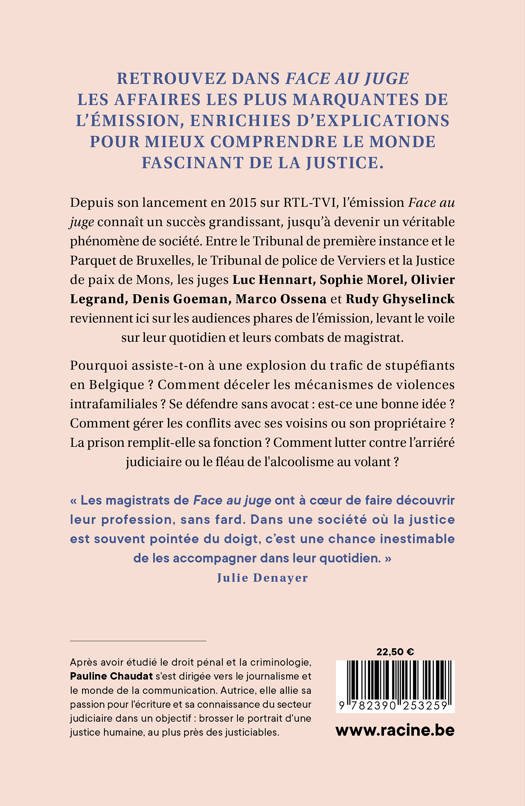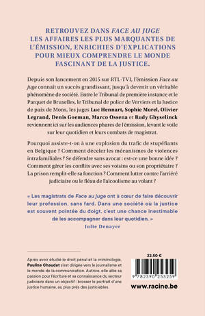 Depuis son lancement en 2015 sur RTL-TVI, l'émission Face au juge connaît un succès grandissant, jusqu'à devenir un véritable phénomène de société. Entre le Tribunal de première instance et le Parquet de Bruxelles, le Tribunal de police de Verviers et la Justice de paix de Mons, les juges Luc Hennart, Sophie Morel, Olivier Legrand, Denis Goeman, Marco Ossena et Rudy Ghyselinck reviennent ici sur les audiences phares de l'émission, levant ainsi le voile sur leur quotidien et leurs combats de magistrat.