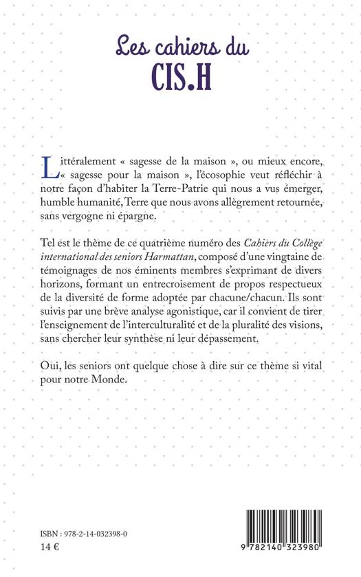 Littéralement sagesse de la maison, ou mieux encore, sagesse pour la maison, l'écosophie veut ré échir à notre façon d'habiter la Terre-Patrie qui nous a vus émerger, humble humanité, Terre que nous avons allègrement retournée, sans vergogne ni épargne. Tel est le thème de ce quatrième numéro des Cahiers du Collège international des seniors Harmattan, composé d'une vingtaine de témoignages de nos éminents membres s'exprimant de divers horizons, formant un entrecroisement de propos respectueux de la diversité de forme adoptée par chacune/chacun. Ils sont suivis par une brève analyse agonistique, car il convient de tirer l'enseignement de l'interculturalité et de la pluralité des visions, sans chercher leur synthèse ni leur dépassement. Oui, les seniors ont quelque chose à dire sur ce thème si vital pour notre Monde.