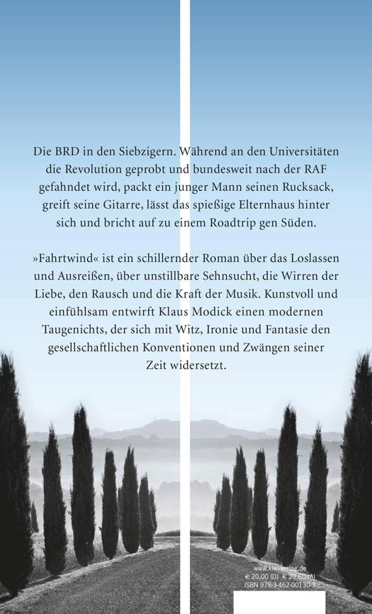 »Fahrtwind« ist ein schillernder Roman über das Loslassen und Ausreißen, über unstillbare Sehnsucht, die Wirren der Liebe, den Rausch und die Kraft der Musik. Kunstvoll und einfühlsam porträtiert Klaus Modick einen modernen Taugenichts, der sich mit Witz, Ironie und Fantasie den gesellschaftlichen Konventionen und Zwängen seiner Zeit widersetzt. Und Eichendorff winkt aus der Ferne.