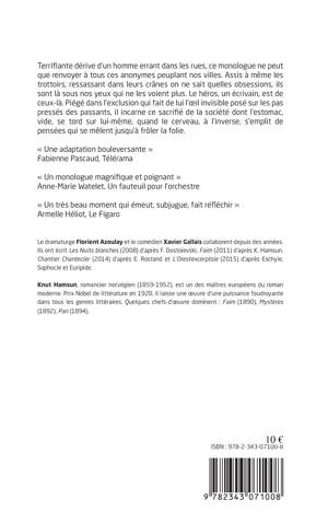 Terrifiante dérive d'un homme errant dans les rues, ce monologue ne peut que renvoyer à tous ces anonymes peuplant nos villes. Assis même les trottoirs, ressassant dans leurs crânes on ne sait quelles obsessions, ils sont là sous nos yeux qui ne les voient plus. Le héros, un écrivain, est de ceux-là. Piégé dans l'exclusion qui fait de lui l'il invisible posé sur les pas pressés des passants, il incarne ce sacrifié de la société dont l'estomac vide, se tord sur lui-même, quand le cerveau, à l'inverse, s'emplit de pensées qui se mêlent jusqu'à frôler la folie.