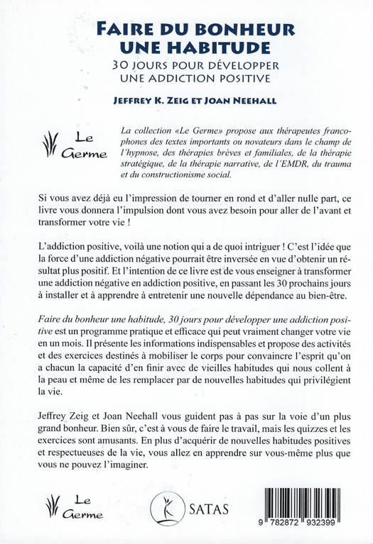 Si vous avez déjà eu l'impression de tourner en rond et d'aller nulle part, ce livre vous donnera l'impulsion dont vous avez besoin pour aller de l'avant et transformer votre vie ! L'addiction positive, voilà une notion qui a de quoi intriguer ! C'est l'idée que la force d'une addiction négative pourrait être inversée en vue d'obtenir un résultat plus positif. Et l'intention de ce livre est de vous enseigner à transformer une addiction négative en addiction positive, en passant les 30 prochains jours à installer et à apprendre à entretenir une nouvelle dépendance au bien-être. Faire du bonheur une habitude, 30 jours pour développer une addiction positive est un programme pratique et efficace qui peut vraiment changer votre vie en un mois. Il présente les informations indispensables et propose des activités et des exercices destinés à mobiliser le corps pour convaincre l'esprit qu'on a chacun la capacité d'en finir avec de vieilles habitudes qui nous collent à la peau et même de les remplacer par de nouvelles habitudes qui privilégient la vie. Jeffrey Zeig et Joan Neehall vous guident pas à pas sur la voie d'un plus grand bonheur. Bien sûr, c'est à vous de faire le travail, mais les quizzes et les exercices sont amusants. En plus d'acquérir de nouvelles habitudes positives et respectueuses de la vie, vous allez en apprendre sur vous-même plus que vous ne pouvez l'imaginer.