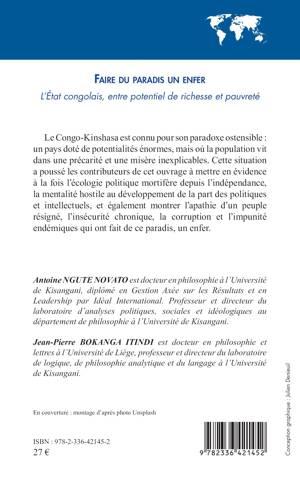 Le Congo-Kinshasa est connu pour son paradoxe ostensible : un pays doté de potentialités énormes, mais où la population vit dans une précarité et une misère inexplicables. Cette situation a poussé les contributeurs de cet ouvrage à mettre en évidence à la fois l’écologie politique mortifère depuis l’indépendance, la mentalité hostile au développement de la part des politiques et intellectuels, et également montrer l’apathie d’un peuple résigné, l’insécurité chronique, la corruption et l’impunité endémiques qui ont fait de ce paradis, un enfer.